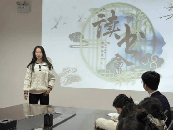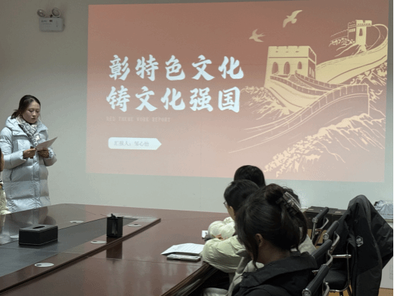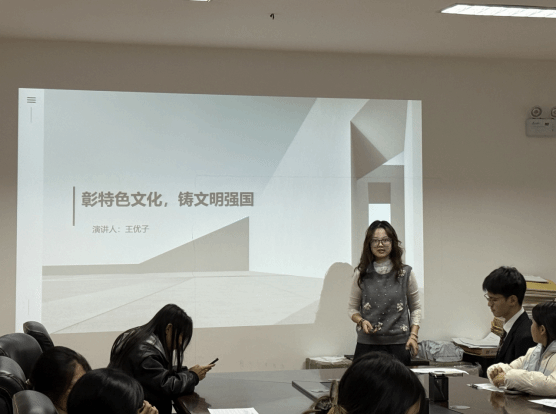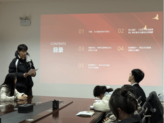 活动第一环节为学生主讲人围绕《习近平谈治国理政》第五卷专题八“发展新时代中国特色社会主义文化”的研读心得进行展示汇报。