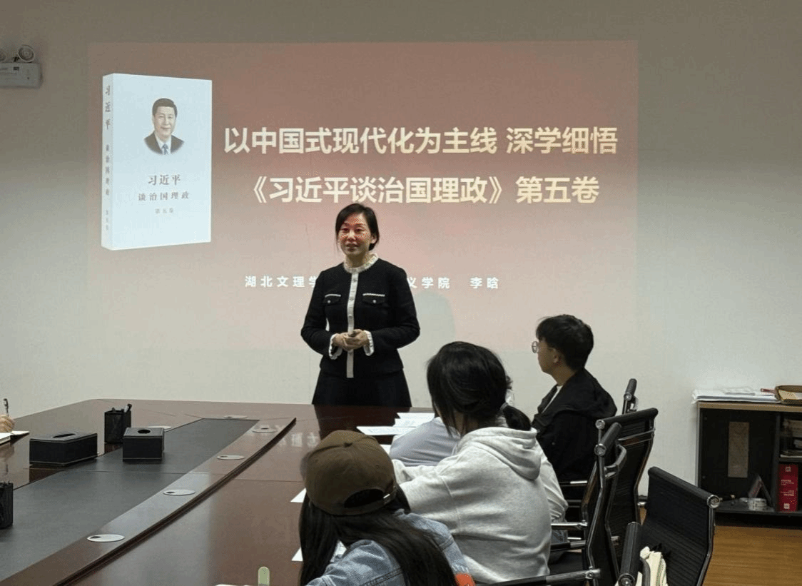 汇报结束后,李晗老师作了题为“以中国式现代化为主线 深学细悟《习近平谈治国理政》第五卷”的学术讲座。李老师以党领导人民探索中国式现代化道路的伟大实践与辉煌成就勉励号召同学们认真读原著、学原文、悟原理,自觉做习近平新时代中国特色社会主义思想的积极传播者与践行者,在以中国式现代化全面推进社会主义现代化强国建设的新征程中挺膺担当。